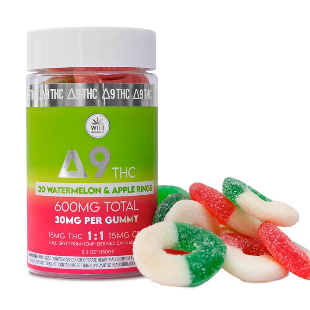 The chewy, juicy, and sugary watermelon & apple rings we all love made even better with USA-Hemp grown delta 9! Wild Orchard Delta 9 Watermelon & Apple Rings are a convenient way to experience the potent, uplifting effects of Delta 9. Formulated with full-spectrum, these potent and flavorful delta 9 gummy rings give you the perfect balance of fruity and tart flavor in every bite. For superior quality and next-level purity, all Wild Orchard Co. Delta 9 is 100% hemp-derived and USA-grown.